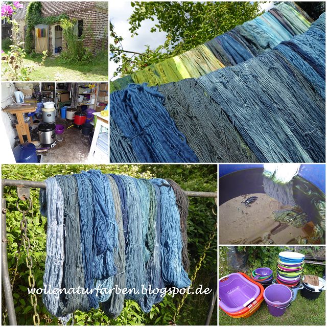 Gefärbt habe ich vor allem mit Indigo und bewußt überfärbt habe ich Farbtöne von früheren Färbungen die mir nicht gefielen und Gelbtöne für Grün. Alles landetete im Indigotopf. :-) Bin immer ganz gespannt und dann auch immer wieder überrascht welche Färbeabstufungen da zu Tage treten, nach der Verblaung an der frischen Luft.